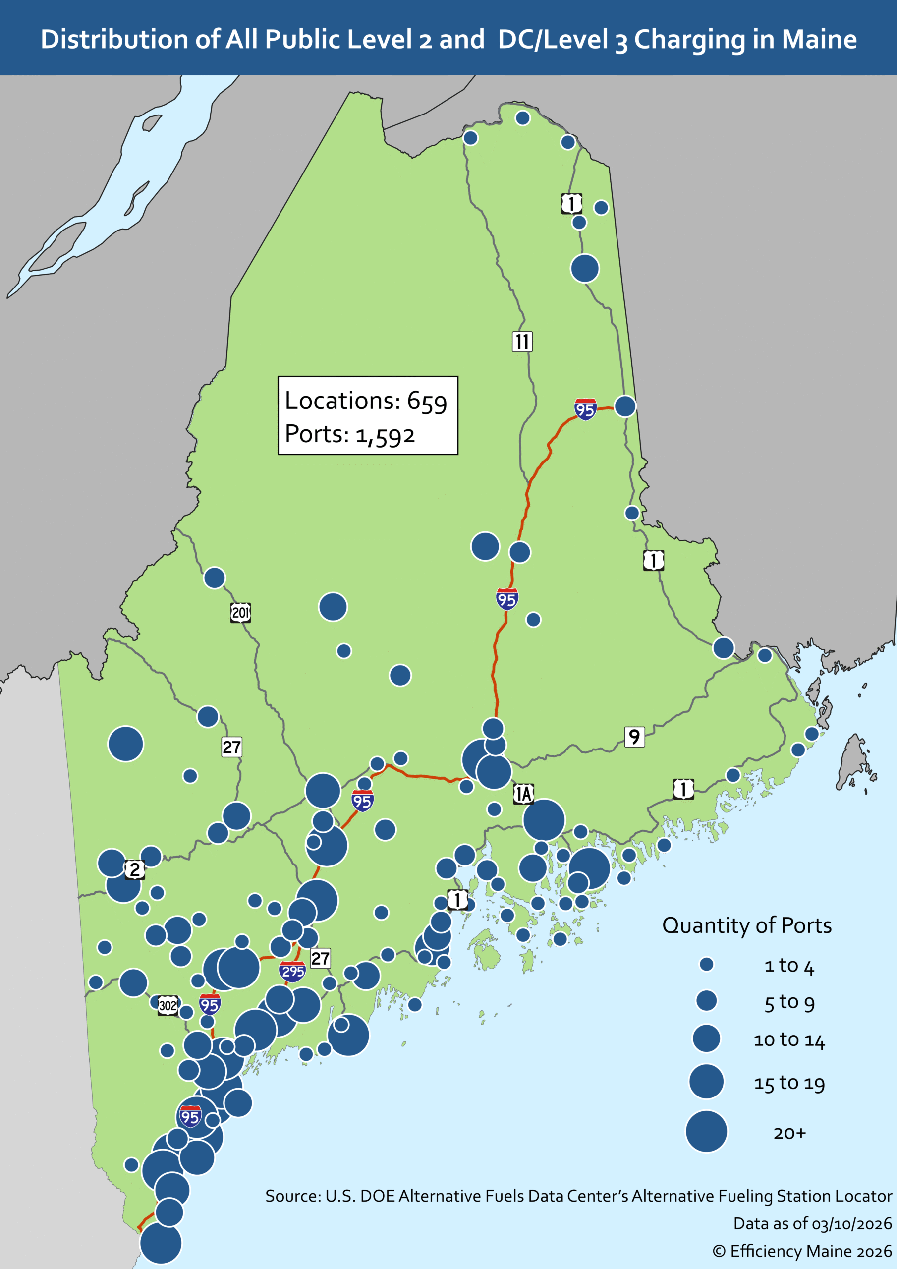Maine has more than 650 public electric vehicle (EV) charging locations with over 1,500 charging ports. Click here to learn about Maine’s initiatives to expand public EV charging.